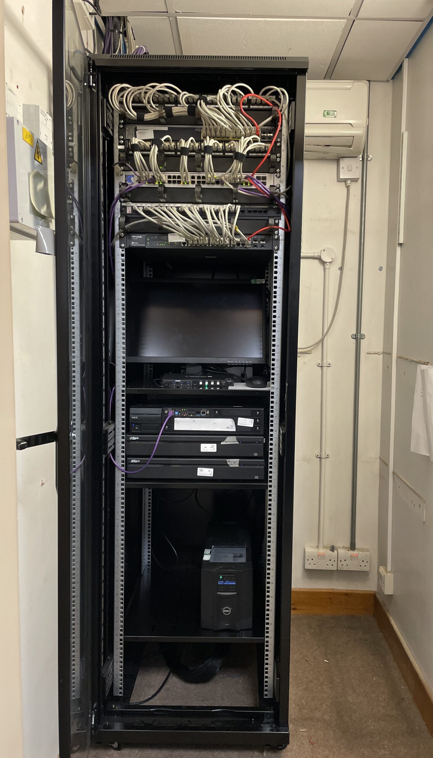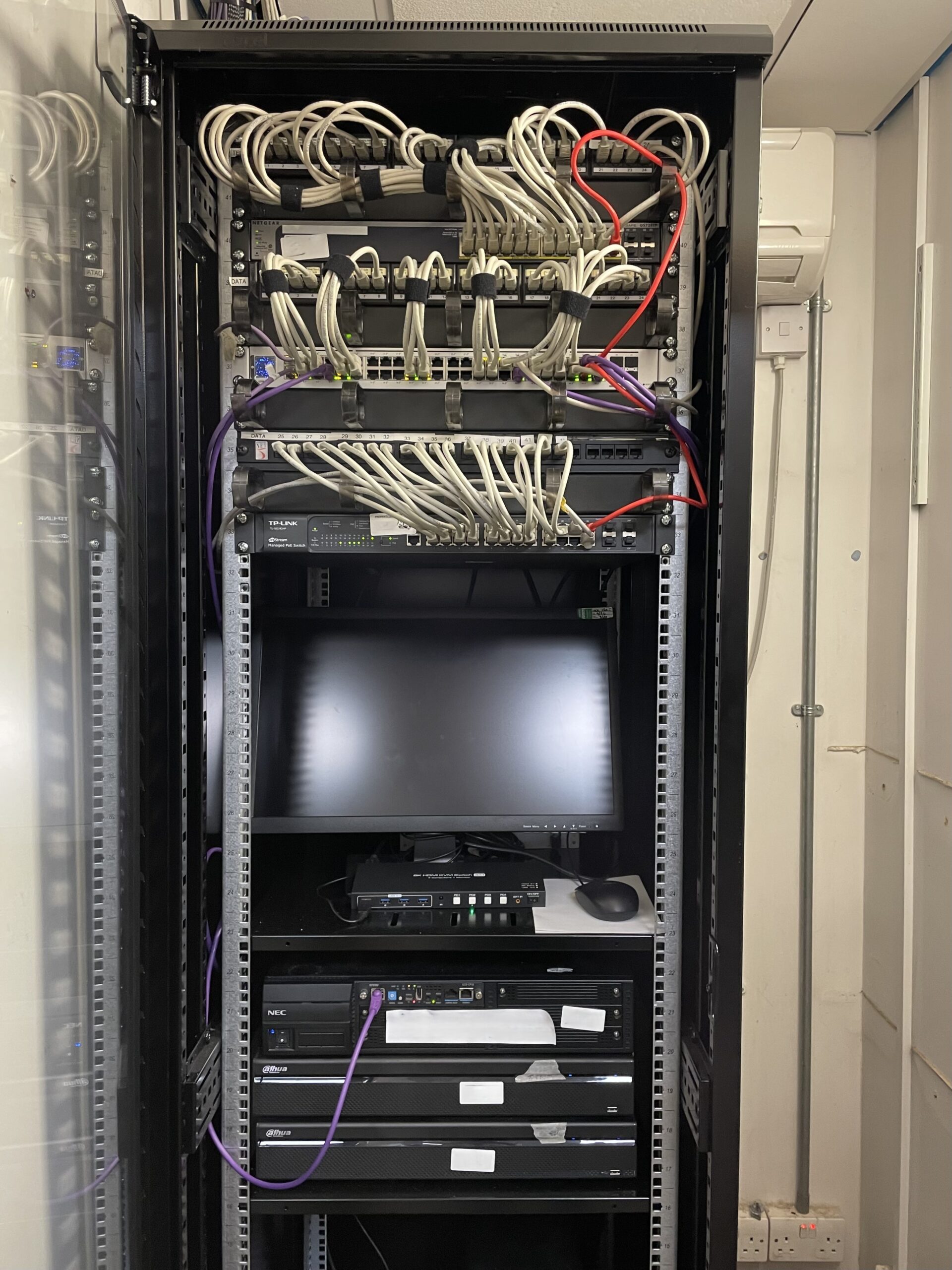 Leveraging our expertise in network infrastructure, we removed the outdated LAN equipment and replaced it with modern components, including a new switch, patch panel, and power distribution unit. We also implemented tidy cable management and integrated a bespoke built-in monitor for CCTV review, ensuring a clean and functional setup designed for long-term reliability.